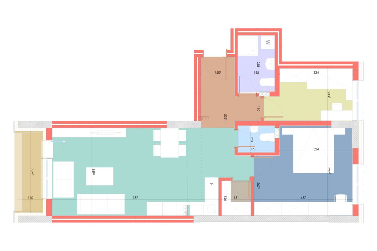 Banesa është e orientuar në Veri-Perëndim dhe ka këtë rënditje: Qëndrimi ditor | Kuzhinë me tryezari | 2 Dhoma gjumi | 1 Banjo | 1 Tualet | 1 Depo | 1 Ballkon.